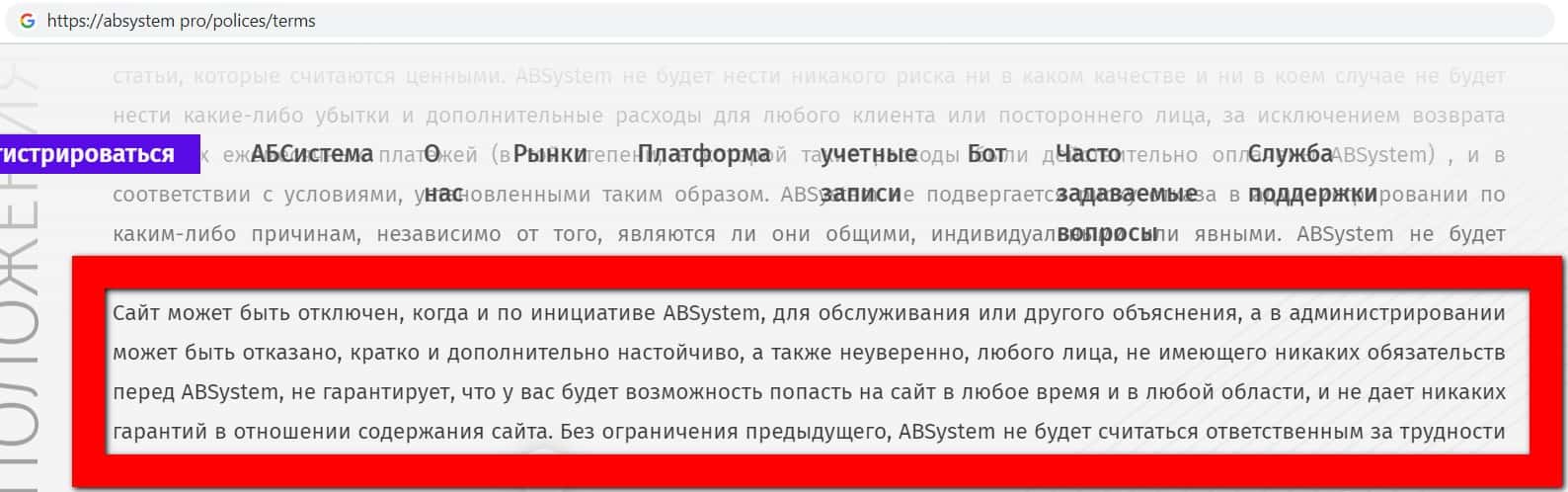 В данном пункте соглашения контора жуликов АБ Систем указала, что может приостанавливать работу интернет-ресурса, и не гарантирует его корректную работу на постоянной основе.