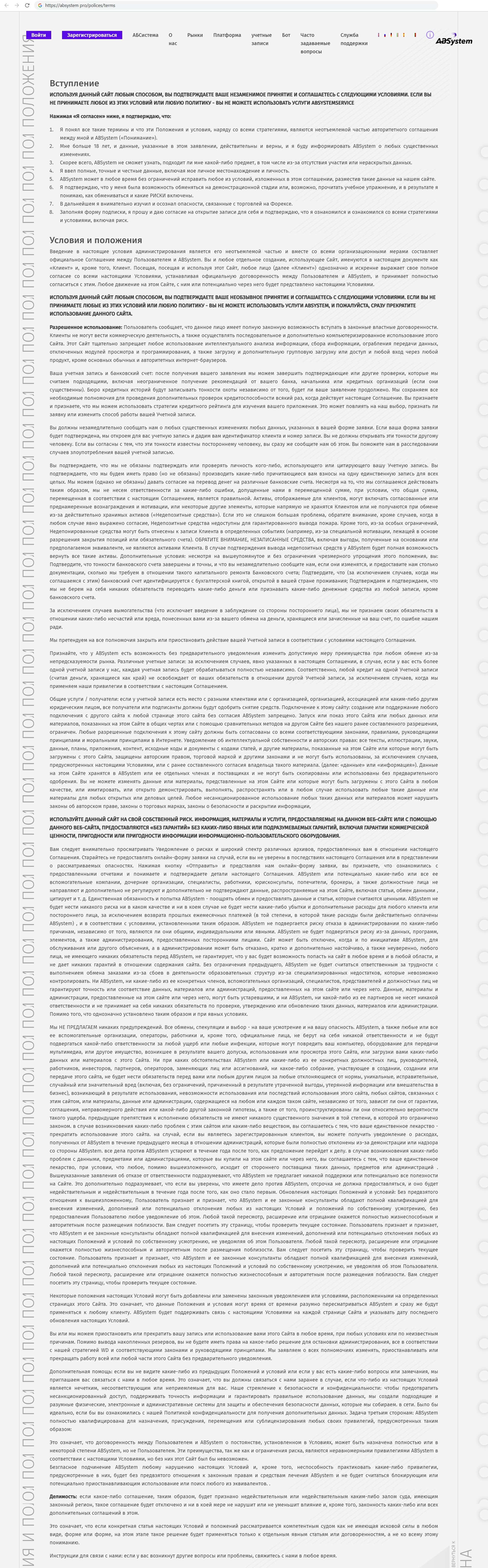 Предлагаем вам ознакомится со всеми пунктами полного клиентского соглашением финансовых мошенников АБ Систем, которое содержит массу подозрительных пунктов.