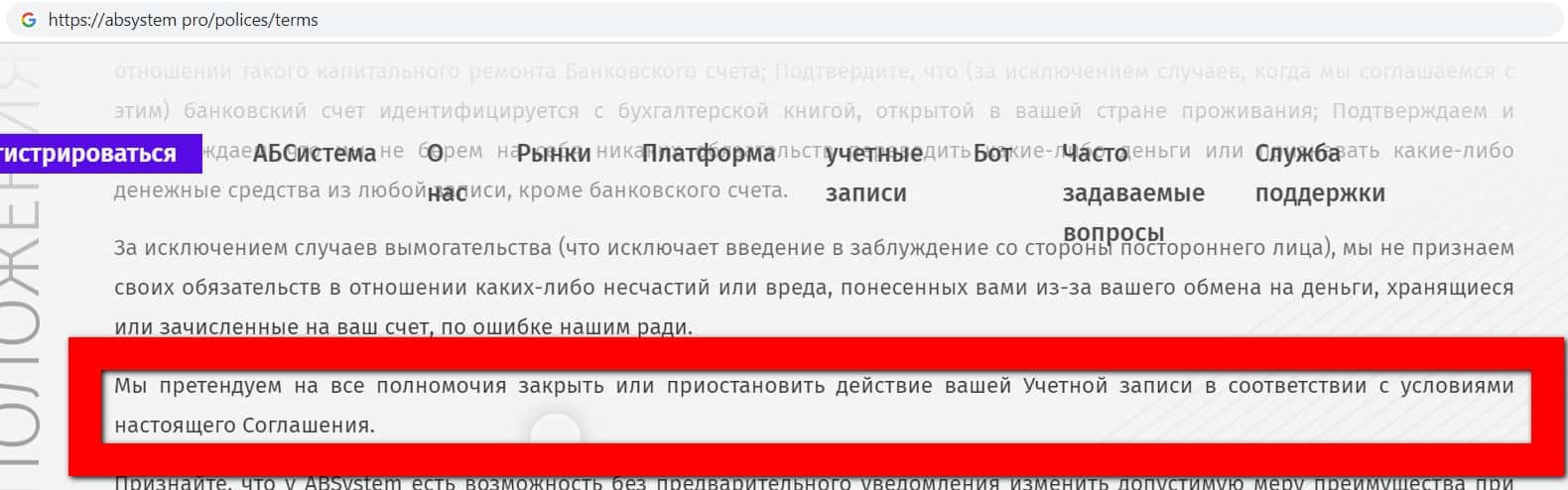 Так же фирма финансовых аферистов АБ Систем указала в своём соглашении, что имеет право заблокировать абсолютно любого клиента лишь по собственному усмотрению.