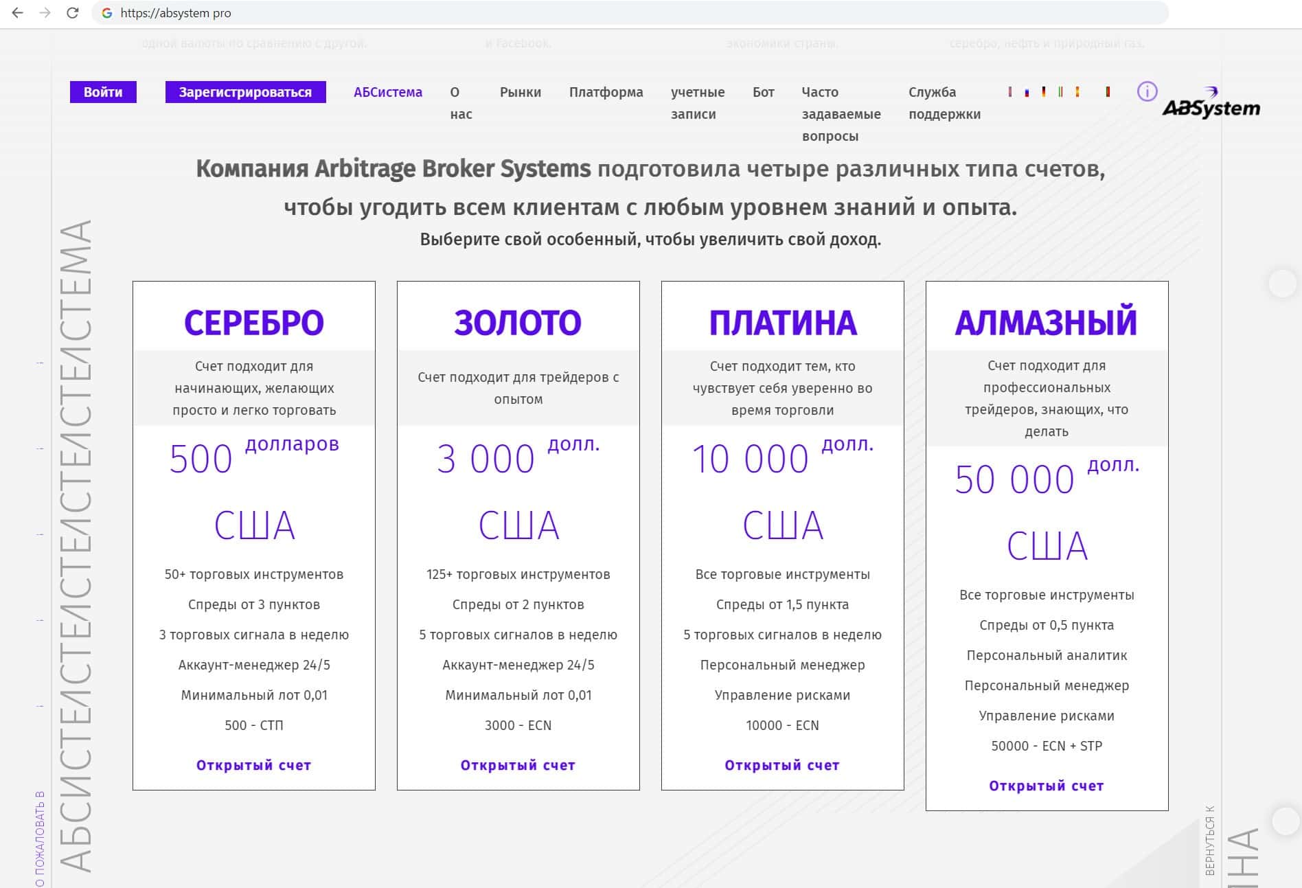 Махинаторы АБ Систем представили своим клиентам торговые счета, которые отличаются услугами и минимальным депозитом, который варьируется от 500 до 50000 долларов.