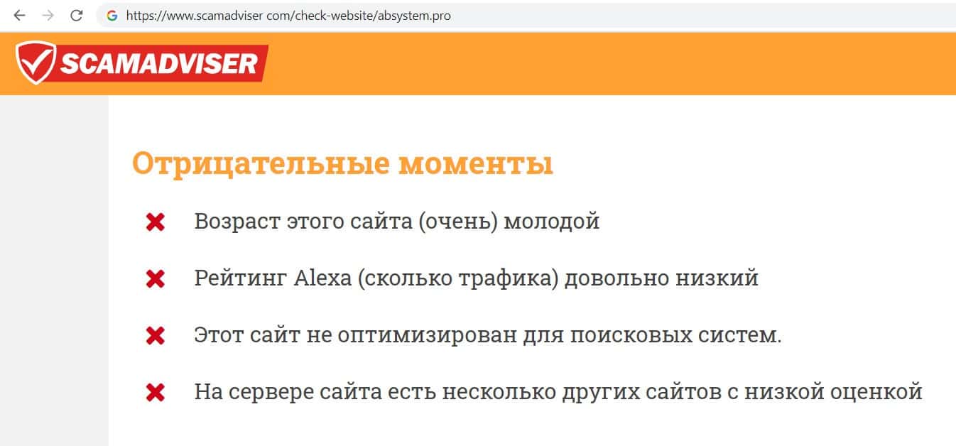 Мы так же проверили сайт кидал ABSystem Pro через сайт scamadviser com. Оказалось, что сайт мошенников очень молодой и никак не оптимизирован для поисковых систем.
