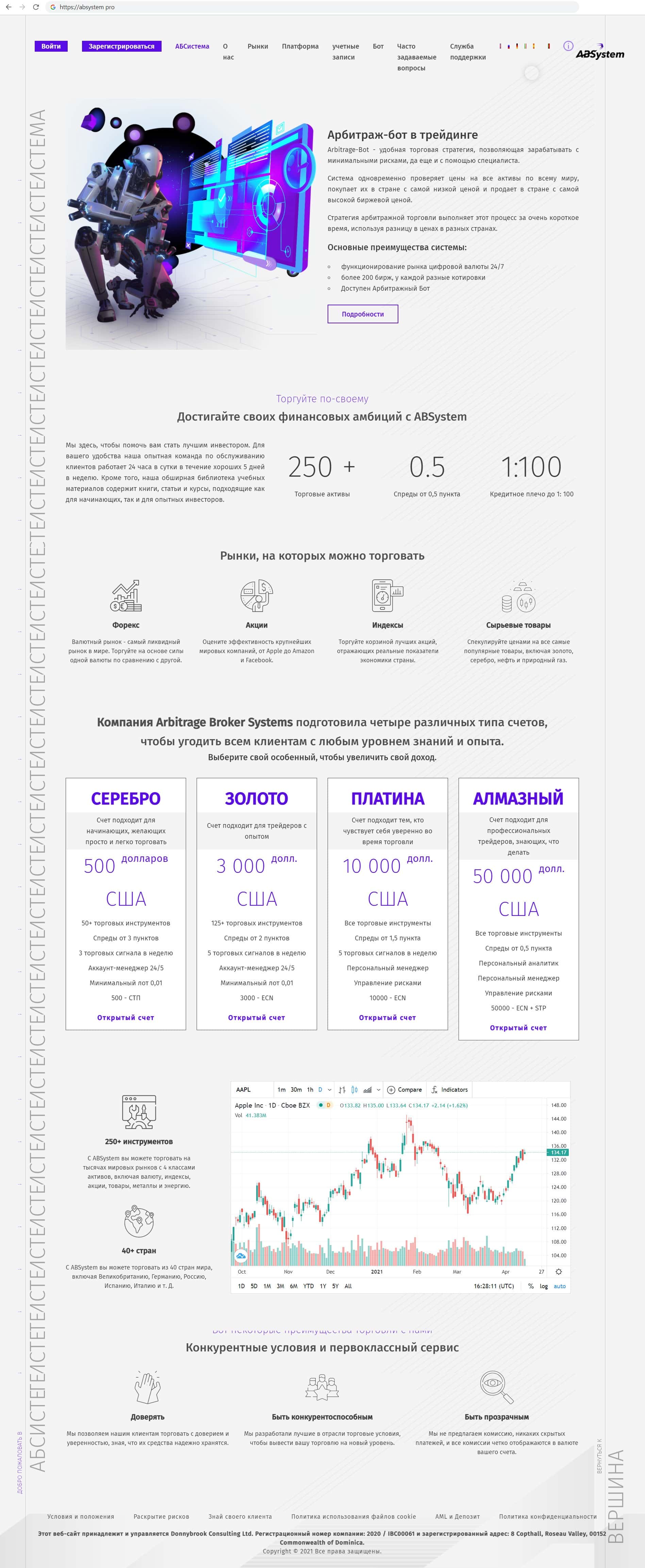 Главный сайт АБ Систем выполнен в ужасном стиле. Сразу бросается в глаза то, что жулики создавали его по бесплатному шаблону лишь для привлечения внимания пользователей.