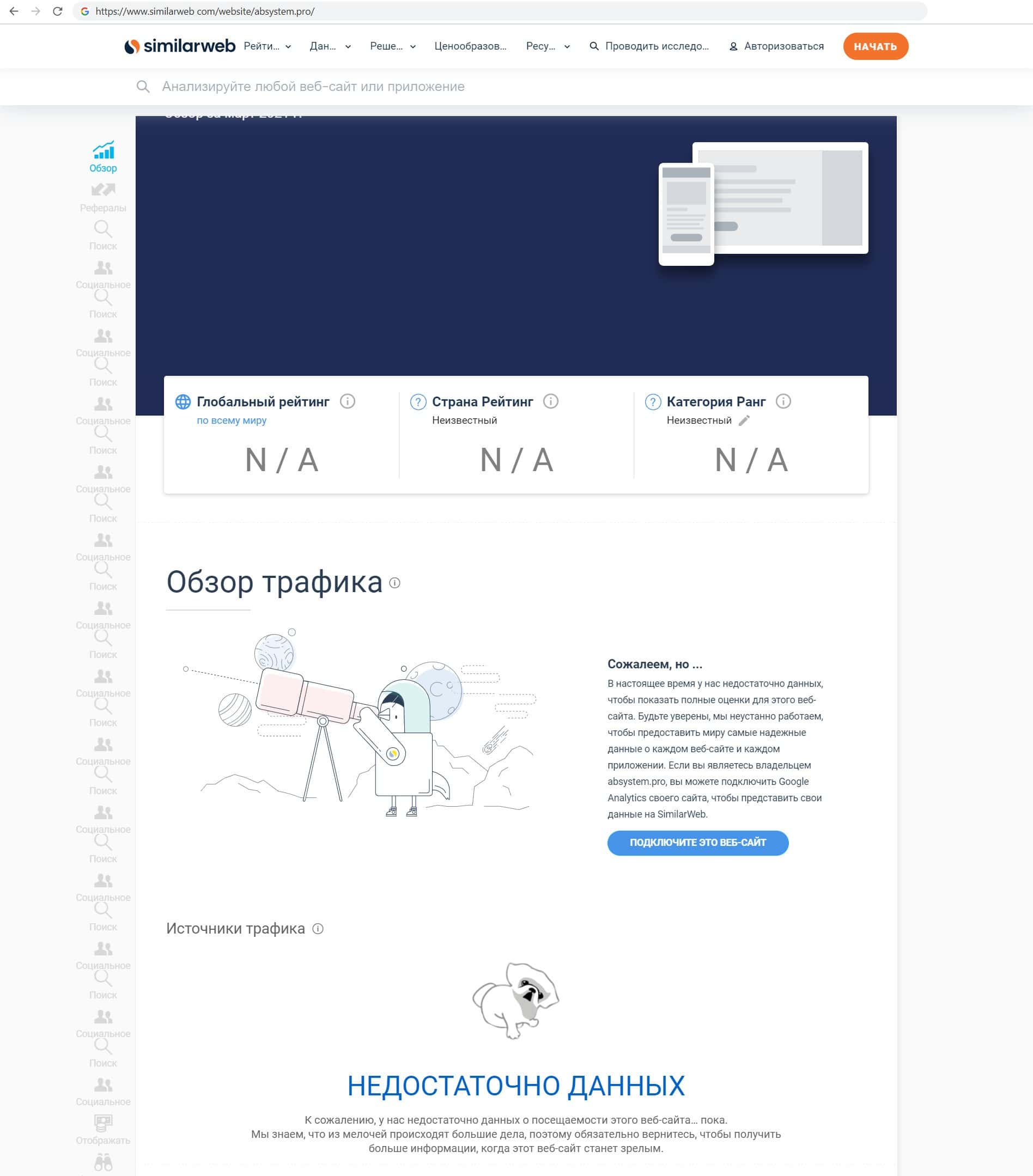 Для того, чтобы узнать трафик главного сайта кидал ABSystem Pro мы воспользовались сайтом similarweb com. Выяснилось, что международный сервис не знает о существовании этой конторы.