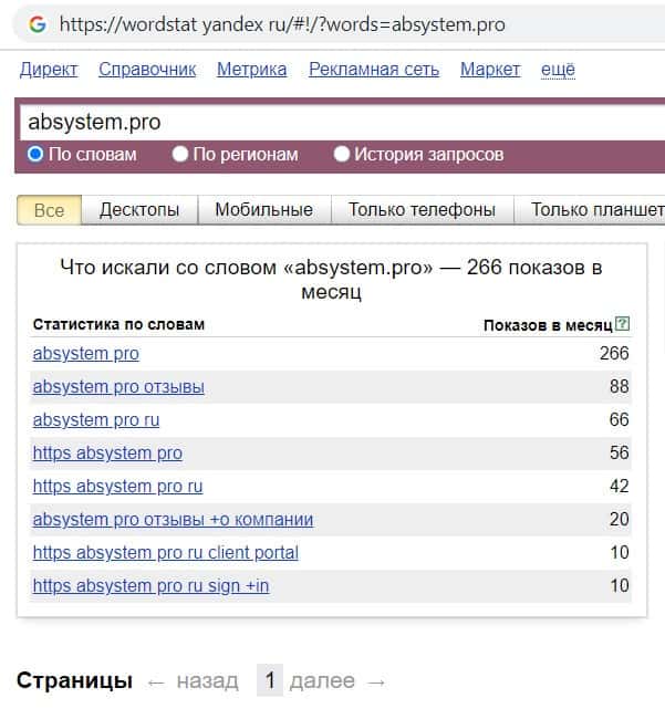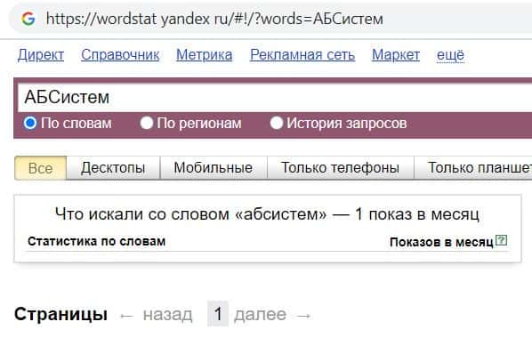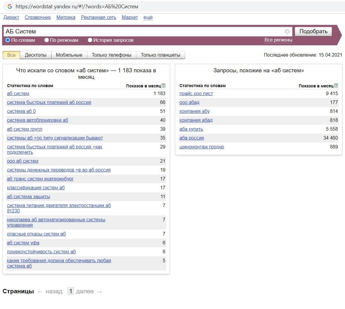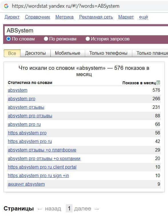 Мы проверили количество запросов компании ABSystem Pro в Яндексе по названию фирмы, а именно "ABSystem". 576 раз пользователи совершили данный запрос в течении месяца.