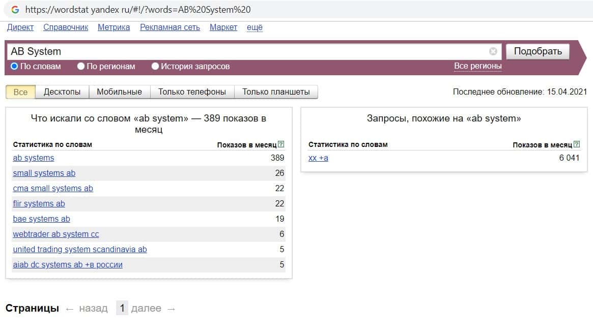 Так же мы проверили количество запросов конторы ABSystem Pro по названию компании с пробелом, а именно "AB System". Этот запрос пользователи совершили 389 раз.