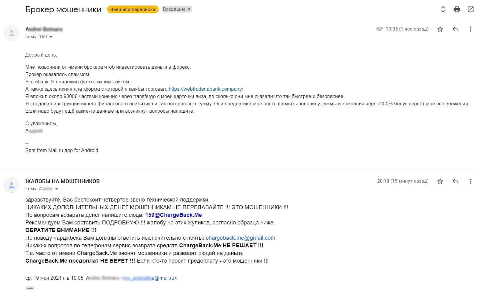 На почтовый адрес сайта по сбору информации о деятельности мошенников форекс пришла жалоба на контору АБанк Компани, которая развела клиента на деньги совместно с Луно.