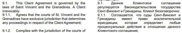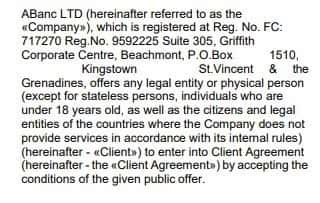 В договоре форекс-конторы АБанк Компани описано тот факт, что лохотрон регулировался законодательством оффшорного государства Сент-Винсент и Гренадины, но лицензии не было.