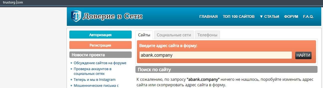 Все же нам стало интересно и мы решили проверить возраст домена сайта мошенников АБанк Компани. Как оказалось даже ресурс trustorg com не смог определить их существование.