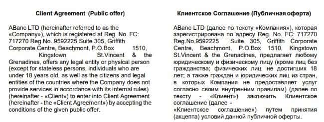Из договора шулерской конторы ABank Company, который случайным образом остался на дополнительных сайтах, стало известно, что ею владела оффшорная компания ABanc LTD.