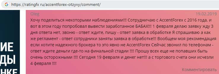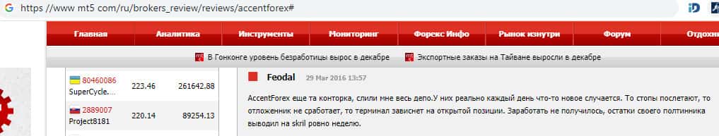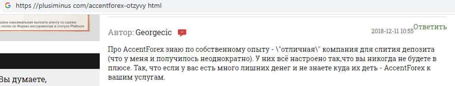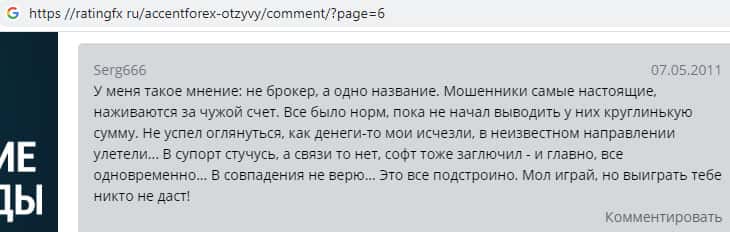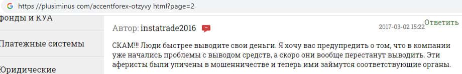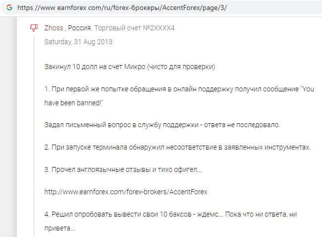 На картинке, указанной ниже, можно прочесть отзыв обманутого пользователя о том, что представители аферной форекс конторы AccentForex внаглую списали с его счета партнерские деньги, а потом сослались на какую-то безосновательную ересь. В общем, денежные средства так и не были возвращены на торговый счет мужчины.
