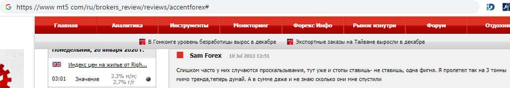На скриншоте расположенном ниже, можно прочесть отзыв рассерженного клиента, который просто находится в шоке от торговли с мошеннической форекс компанией AccentForex, которая постоянно то счета сливает, то терминал зависает у них на открытой позиции, то стопы послетают. В общем, не брокер, а сплошное недоразумение и лохотронщшик.