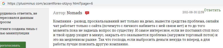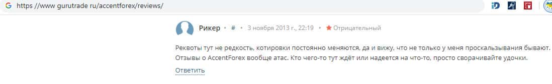На следующем скриншоте продемонстрирован честный отзыв кинутого клиента лживым брокером Акцент Форекс, который ведет нечестную игру: частое неисполнение отложенных ордеров по указанным ценам и смещение цены при открытии-закрытии позиции в худшую сторону. Трейдер предупреждает не связываться с этими ворюгами.