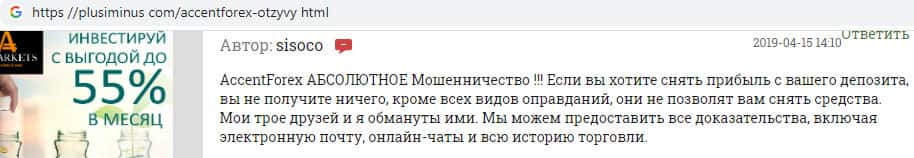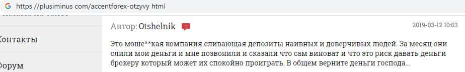 Негативный отзыв обманутого клиента о работе с махинаторской конторой Акцент Форекс