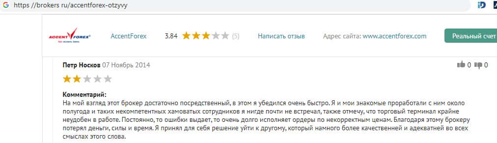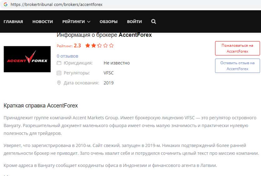 - Низкая оценка махинаторской форекс компании AccentForex при обзоре уважаемого сайта brokertribunal com