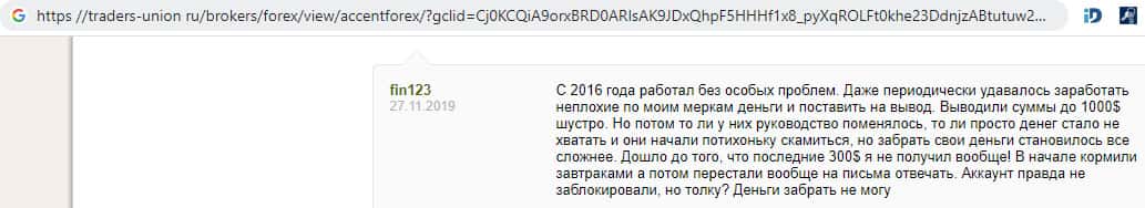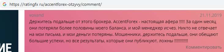 - Негативный отзывов от клиента, которого аферисты из шараги AccentForex нагло кинули