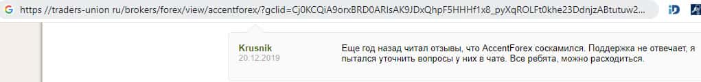 На картинке, расположенной ниже, Вы можете ознакомиться с комментарием недовольного трейдера, который сообщил о том, что брокерская компания Акцент Форекс на самом деле соскамилась и давно обанкротилась. Мужчина попытался в очередной раз связаться с технической поддержкой, но все заявки остались лжеброкером проигнорированы.