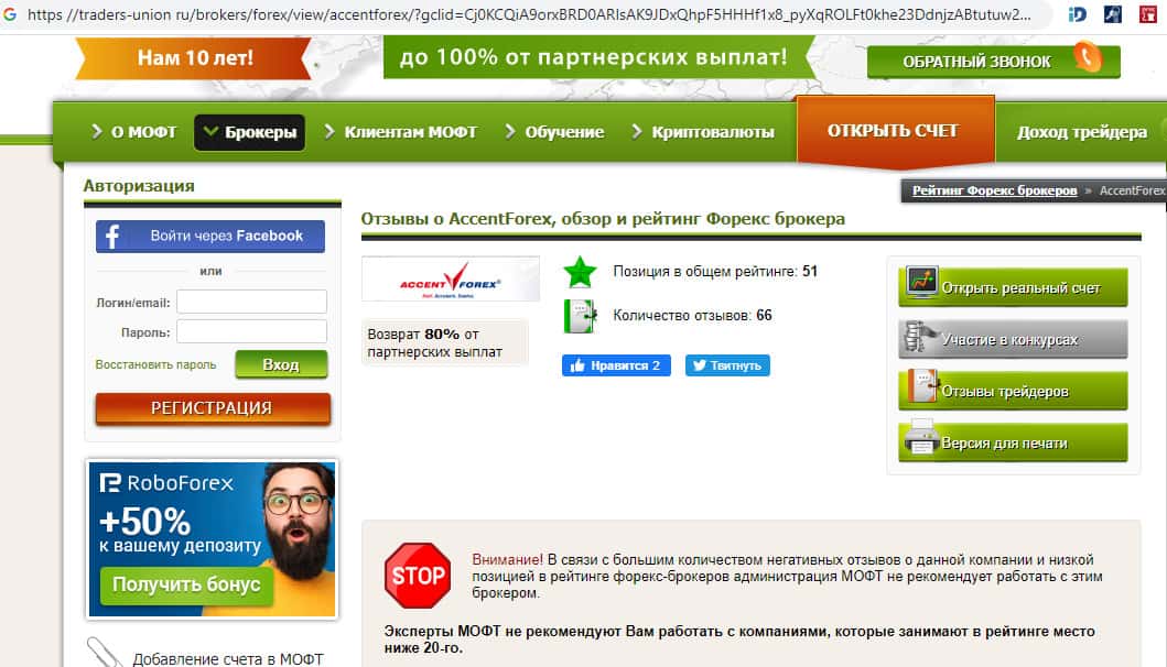 Согласно отзывам и независимых вкладчиков, которые попались на удочку жуликов из шараги Акцент Форекс, основной рейтинг составляет 51. В связи с большим количеством негативных отзывов о данной псевдоброкерской организации и низкой позицией в рейтинге форекс-брокеров сайт не рекомендует работать с этим брокером. Лохотрон, одним словом.