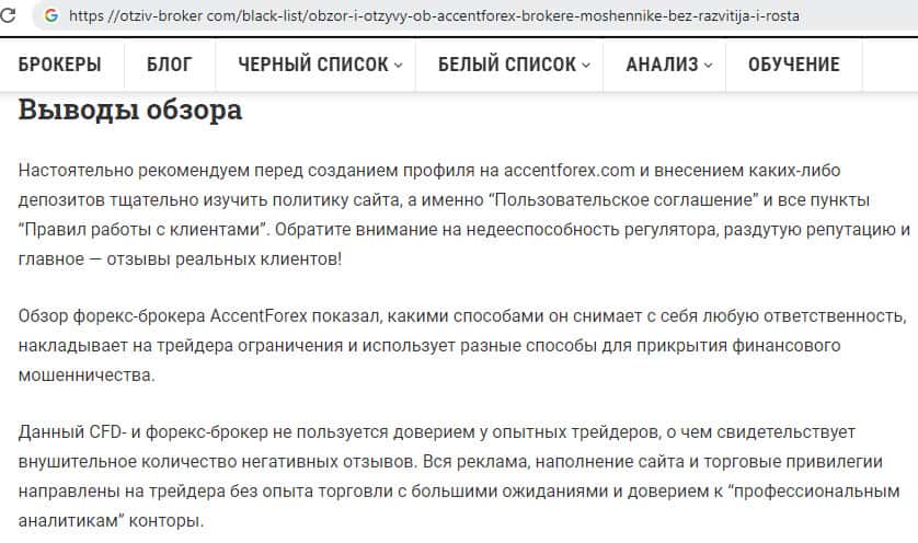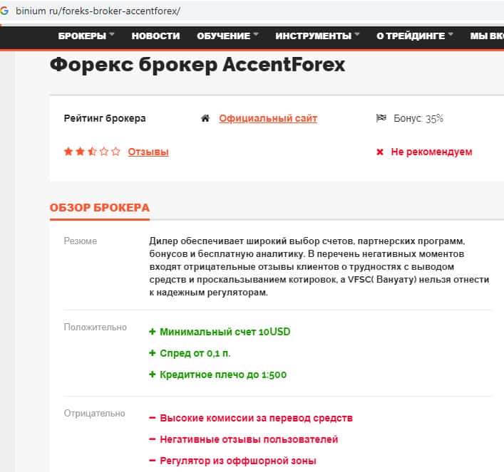 Известный веб-ресурс binium ru перечисляет все минусы шулерского брокера AccentForex