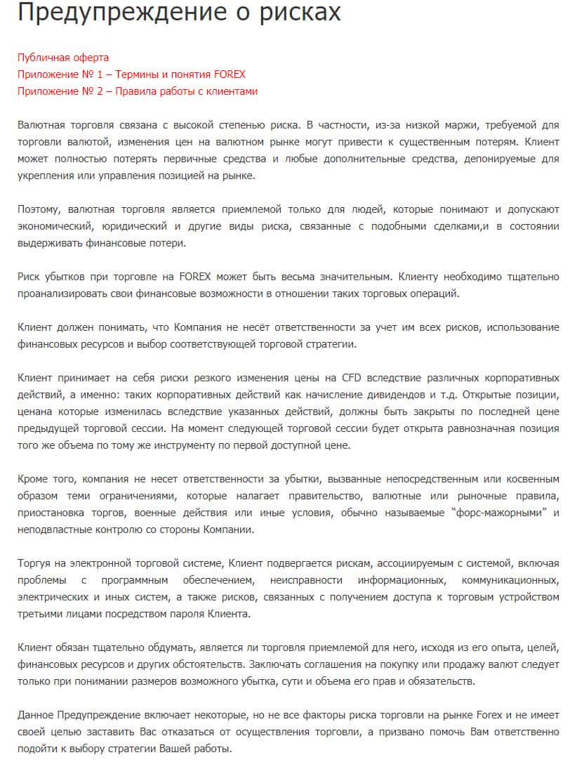 И заканчивает веб-страница грабительского форекс брокера Акцент Форекс очень интересным разделом "Предупреждение о рисках", который посвящен тому, что только клиент несет ответственность и все риски в случае каких-то инцидентов, а вот себя жульнический брокер обезопасил на вполне легальном уровне со всех сторон.