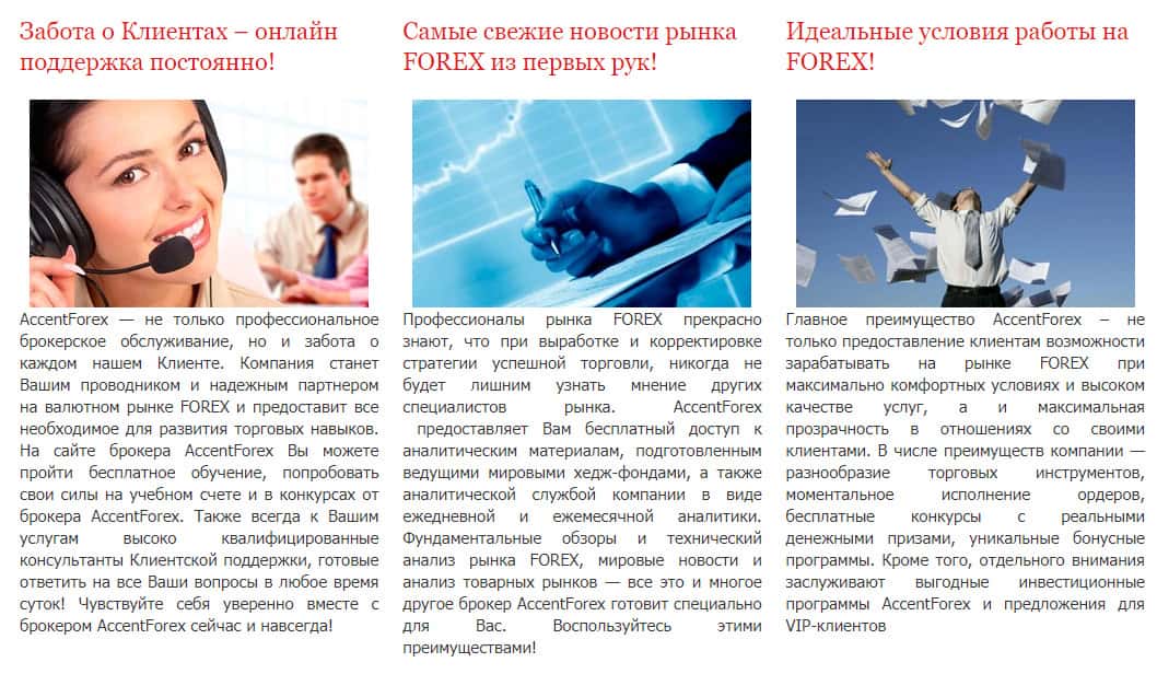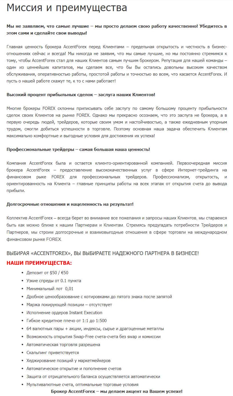 Начинается веб-ресурс мошеннического форекс дилера AccentForex с перечисления преимуществ и основной миссии. Эти ворюги заявляют, что они являются самыми лучшими на форекс на рынке, так как делают свою работу качественно. А на самом деле - в интернете уйма негативных отзывов и жалоб обманутых трейдеров.