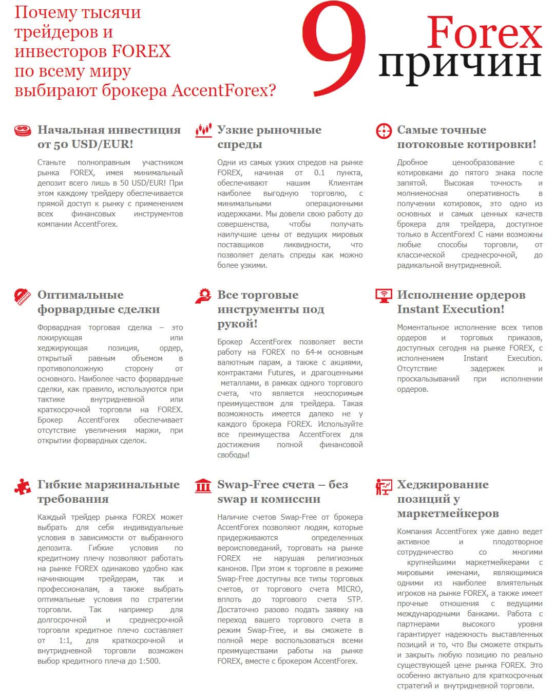 В следующем разделе своего портала махинаторы из AccentForex перечисляют 9 причин, почему все потенциальные клиенты должны начать торговать на форекс рынке именно с ними: начиная с узких рыночных спредов и заканчивая хеджированием позиций у маркетмейкеров. По факту, эти обманщики зарабатывают лишь на обдуривании своих трейдеров на бабки.
