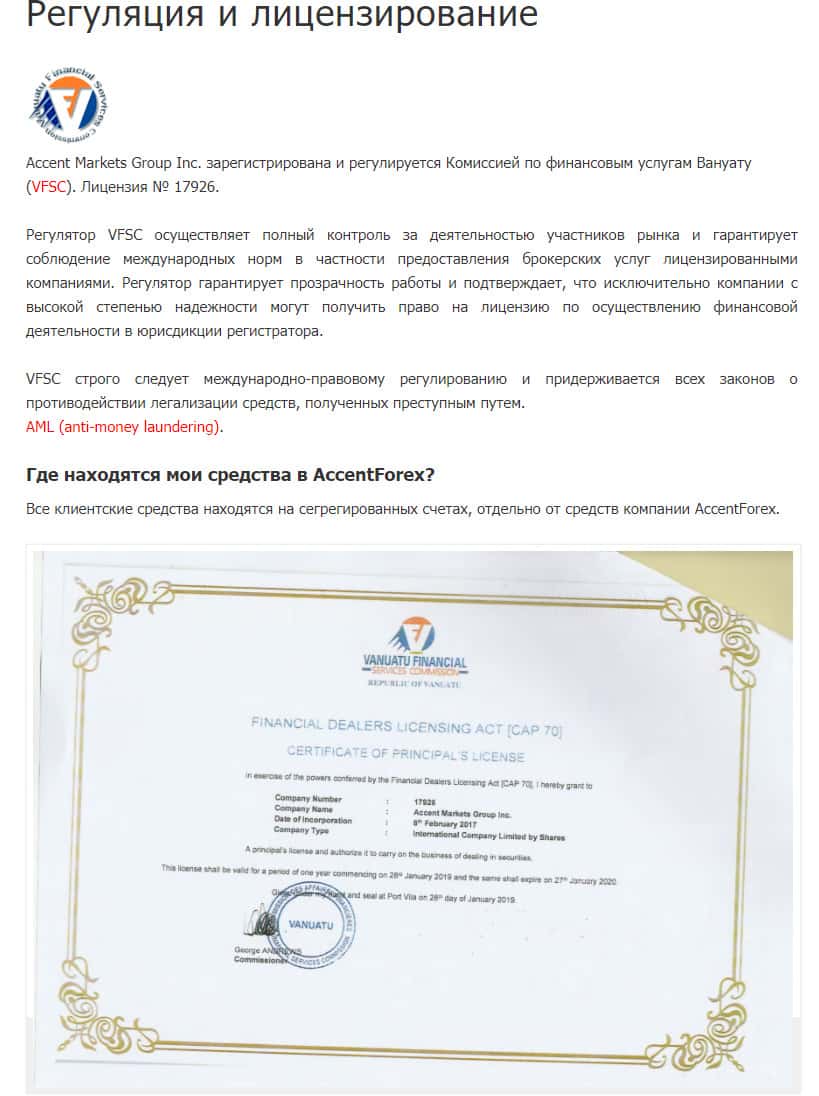 Согласно данным с официального интернет-ресурса псевдоброкерской организации AccentForex данный брокер зарегистрирован и регулируется Комиссией по финансовым услугам Вануату. Но это явно купленная бумажка, тем более далекой зарубежной страны Вануату, куда еще проще слит награбленные денежки у клиентов.