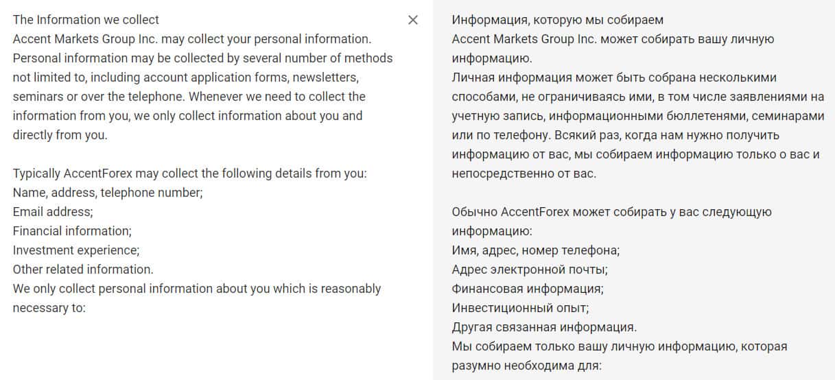 В первом разделе политики конфиденциальности на веб-портале махинаторов из шараги AccentForex располагается информация о запрашиваемых персональных данных трейдеров, с какой целью, куда эти данные пойдут и как будут использованы. По факту, уйма воды и нулевые гарантии для блага самих пользователей.