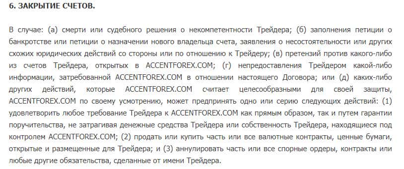 А шестой раздел договора "Закрытие счетов" снова становится на сторону проходимцев из махинаторской брокерской компании Акцент Форекс, так как перечислен целый список причин, из-за которых сотрудники компании могут закрыть счет клиента. В общем, сплошной развод и лохотрон со стороны воровского форекс дилера AccentForex.