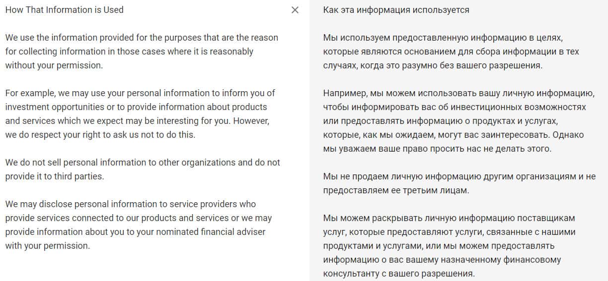 Далее сотрудники мошеннической брокерской организации Акцент Форекс сообщают, что могут использовать собранную персональную информацию о своих пользователях только в разумных целях без разрешения. Они уверяют, что это происходит для лучшего обеспечения и комфортности в работе. А на практике, жулики просто используют данные в корыстных целях.
