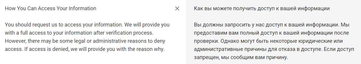 В последнем разделе "Получение доступа к информации клиентов" лживый форекс брокер AccentForex сообщает, что он может предоставить своим трейдерам полный доступ к их же информации только после проверки. Однако могут быть некоторые юридические или административные причины для отказа в доступе. В общем, сплошной лохотрон пользователей.