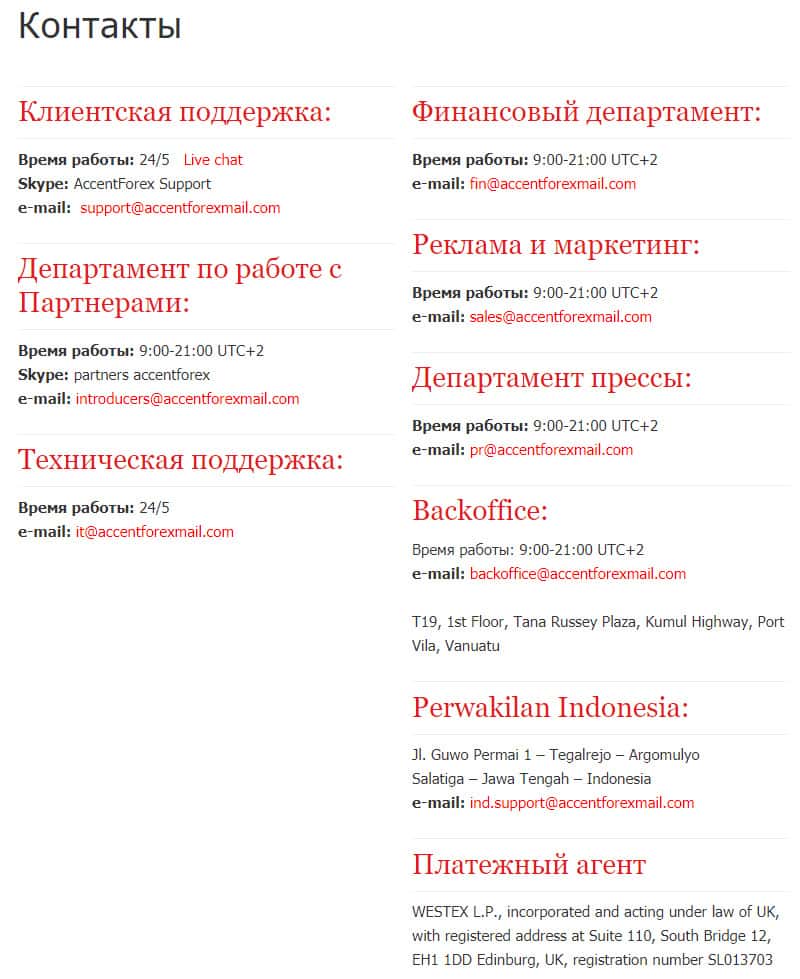 - электронные почты support @accentforexmail com и fin@accentforexmail com и introducers@accentforexmail com и sales@accentforexmail com и pr@accentforexmail com и it@accentforexmail com и backoffice@accentforexmail com и ind.support@accentforexmail com