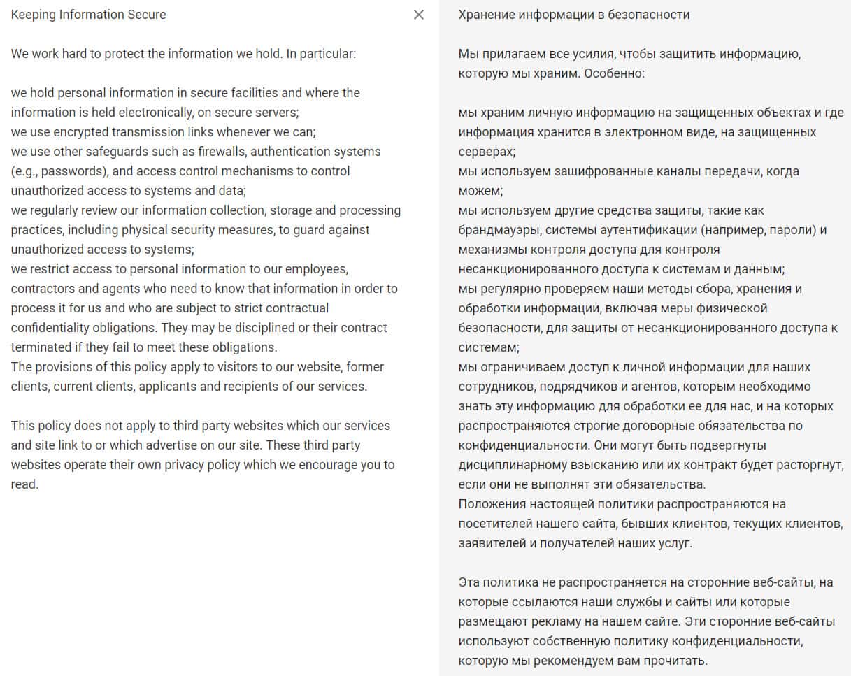 Далее в политике конфиденциальности шулерского форекс дилера Акцент Форекс идет речь о безопасном хранении информации персональной информации о своих трейдерах. Ворюги всеми силами пытаются убедить клиентов в сохранности их личных сведений, а на самом деле прописали на легальном уровне нулевую ответственность.