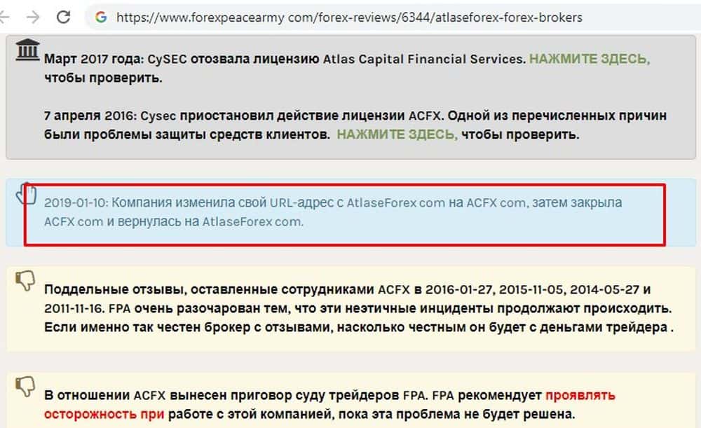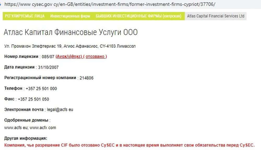 У мошенников ACFX внушительный послужной список, AtlasCapital (это их официальное название) действуют уже почти 20 лет. При этом аферистов периодически пытаются прикрыть, но они возвращаются без особых потерь благодаря прикрытию оффшора. Адрес разводил на Кипре - Арка Макариос 197 Авеню, Гала Тауэр, 4 этаж, CY-3030, Лимассол.