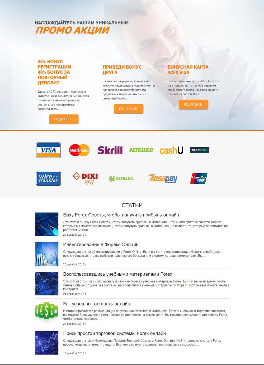 Мошенники ACFX обещают трейдерам поддержку на всех языках 24 часа в сутки. По факту, на их страничке даже нет формы обратной связи и элементарных контактных данных. Собирать их обманутым трейдерам приходится по всей сети и даже после этого мошенники не реагируют на требования вернуть деньги. Контакты кидал: