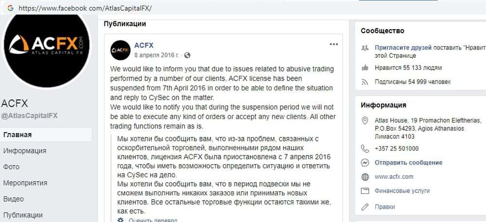 Мошенники ACFX стараются не светиться в социальных сетях, что уже подозрительно. Кажется, что у кидал вообще нет аккаунтов, но нам удалось найти их старую страничку на Фейсбук. Именно ту страничку, на которой аферисты еще в 2016 году оправдывались, почему не могут вернуть трейдерам заработанные деньги. С тех пор она не обновлялась.