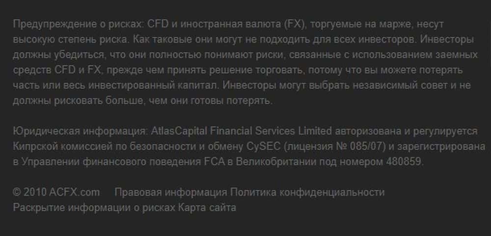 Ссылки на клиентское соглашение на сайте кидал ACFX есть, а вот самого соглашения - нет. То есть, работать трейдеры должны начинать, не зная правил и условий торговли. Это позволяет мошенникам направо и налево кидать трейдеров, закрывать счета и не возвращать депозиты, говоря, что те нарушили какие-то мифические правила.
