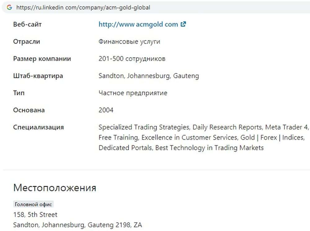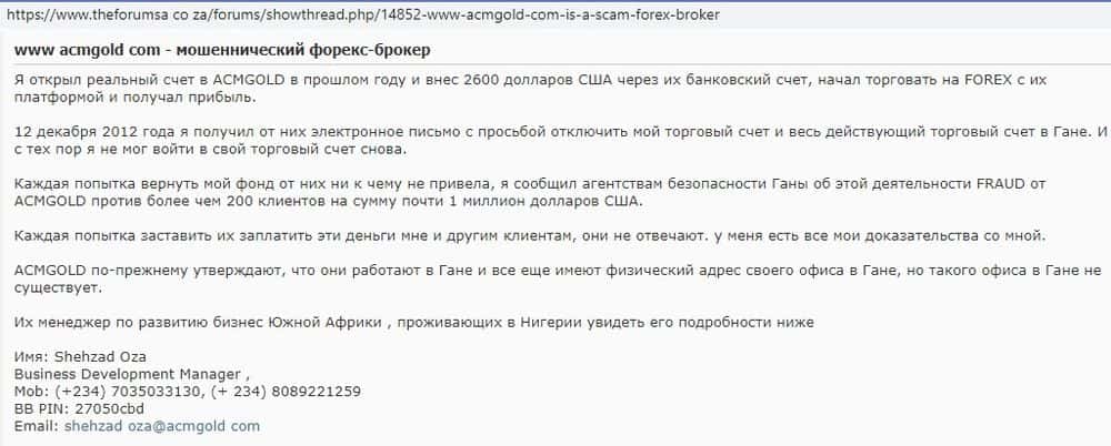 Контора ACM Gold действительно работает давно, по крайней мере, кидать трейдеров аферисты начали уже в 2013 году. На портале theforumsa co za можно найти их отзывы: у одного аферисты увели 2600 долларов, а когда он обратился в службу безопасности республики Гана, ему ответили, что такого офиса не существует.