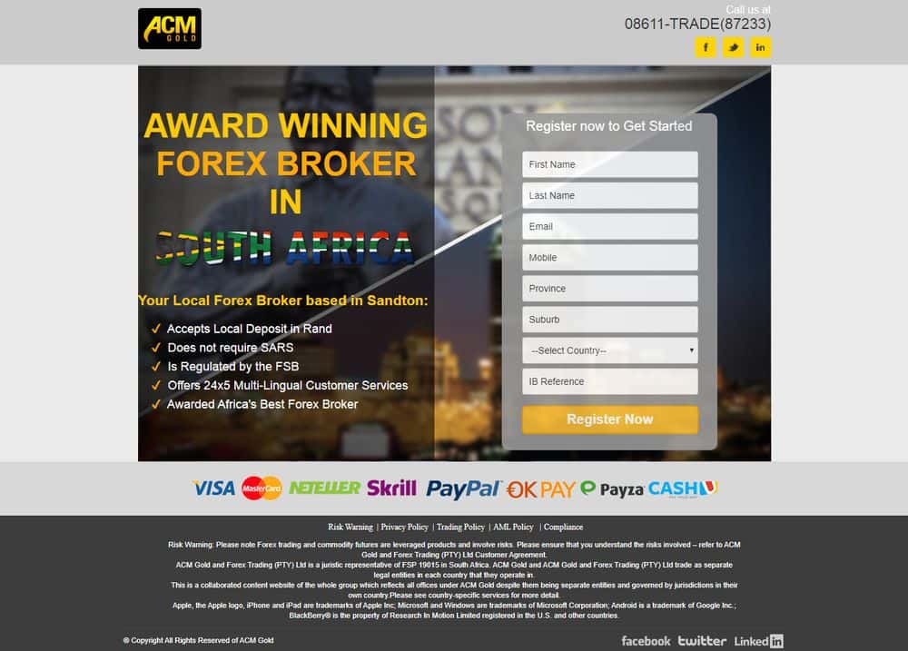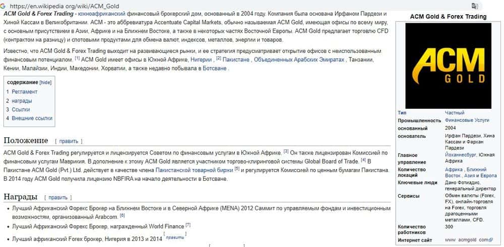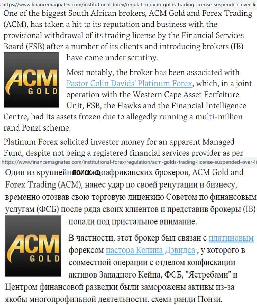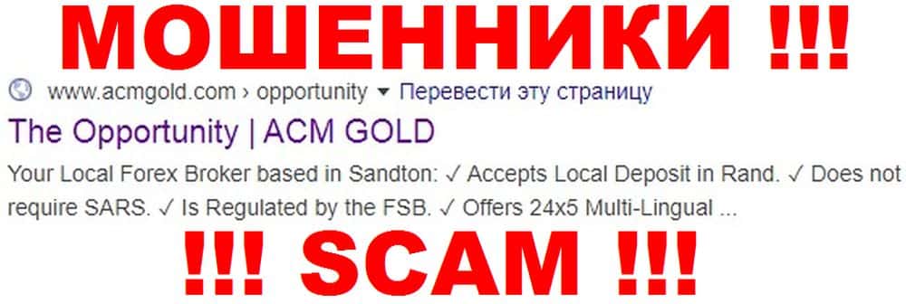 ACM Gold - лохотронщики под видом CFD и Форекс-брокера. Кидалы якобы являются авторизованным поставщиком финансовых услуг в Южной Африке, это вообще одна из немногих контор, которая работает с этим регионом. Аферисты кичились своей репутацией и кучей наград, пока не спалились на масштабных кражах средств трейдеров.