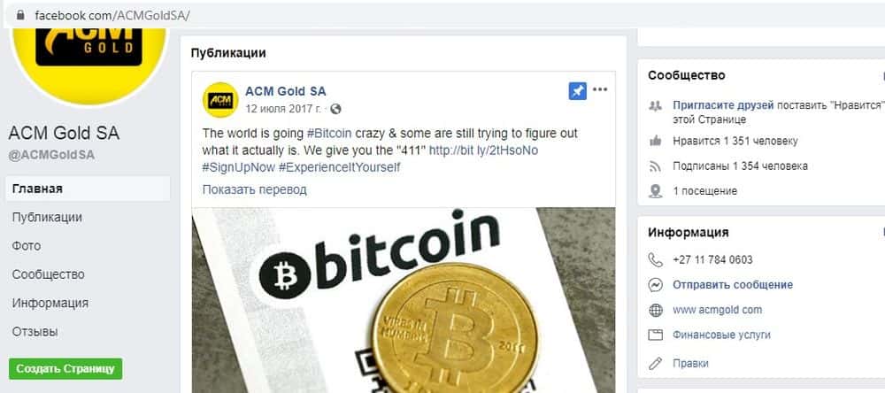 Основную массу трейдеров-новичков разводилы ACM Gold отлавливают в социальных сетях. У них есть страничка на Фейсбук, раскрученная искусственным образом. Полезной информации там нет, зато в каждом посте упоминается, что контора ACM Gold якобы является самым классным и надежным регулируемым брокером и с ней можно заработать.