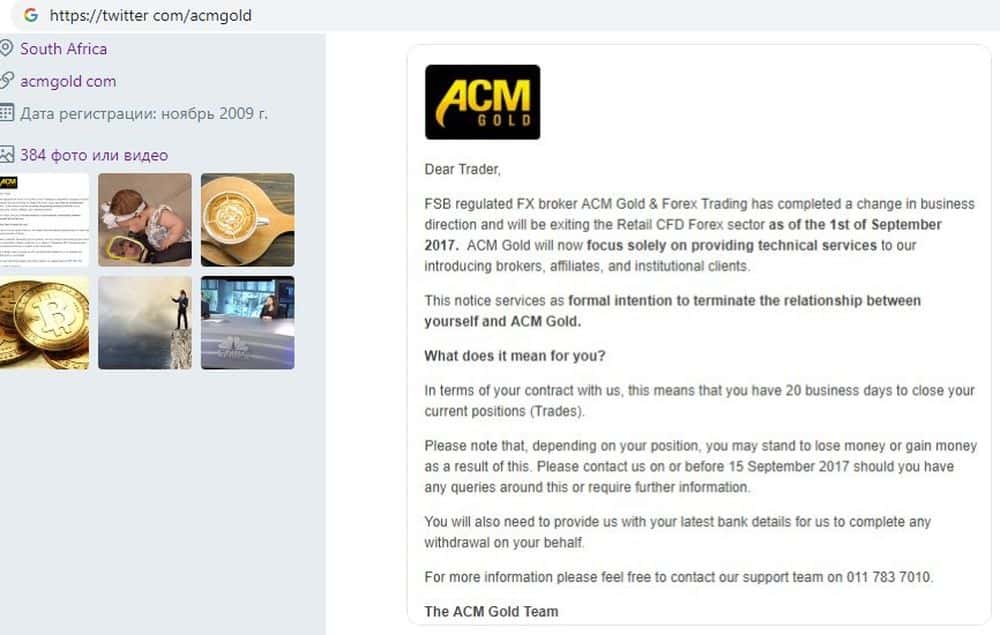 В Твиттере первым постом идет оповещение, что брокер ACM Gold сменил направление деятельности и теперь собирается заниматься контрактами на разницу. Благодаря этой стратегии лохотронщикам АСМ Голд и удалось так долго продержаться на плаву - когда жалоб становится слишком много, они переезжают и меняют набор торговых инструментов.