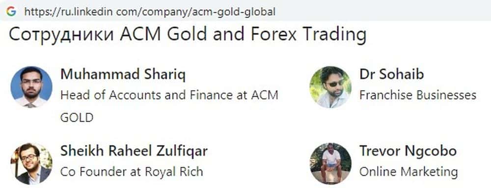 Создатели лохотрона АСМ Голд, согласно Википедии - Ирфан Пардези и Хина Кассам. Начало конторе было положено не в Африке, а в Великобритании. На данный момент в проекте задействовано около 50 человек. По данным сервиса Линкедин, первоначальный скам-проект разделился на два филиала. Конторой ACM Gold на данный момент руководят:
