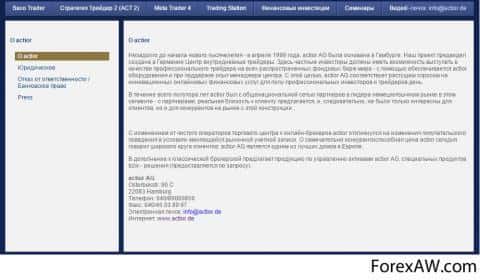 Справочная информация о дилинговом центре Actior взята с официального сайта брокера, поэтому администрация сайта ForexAW.com не может отвечать за ее соответствие действительности. Чаще всего дилинговые центры расхваливают себя на своих официальных сайтах, поэтому данная информация скорее носит рекламный характер и вряд ли отражает реальное положение дел.