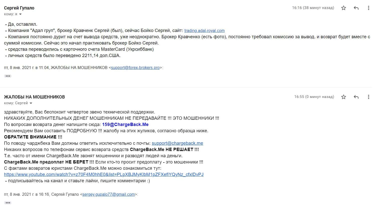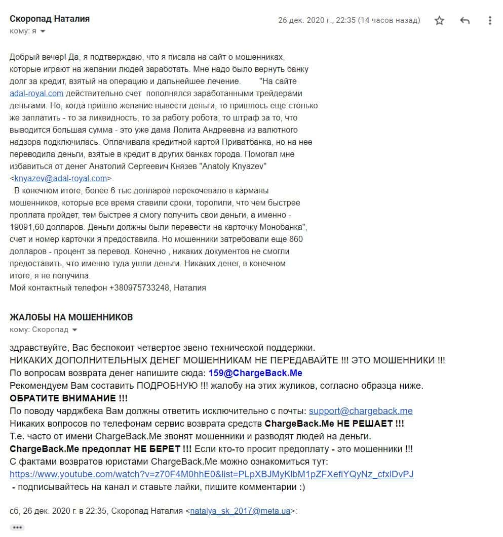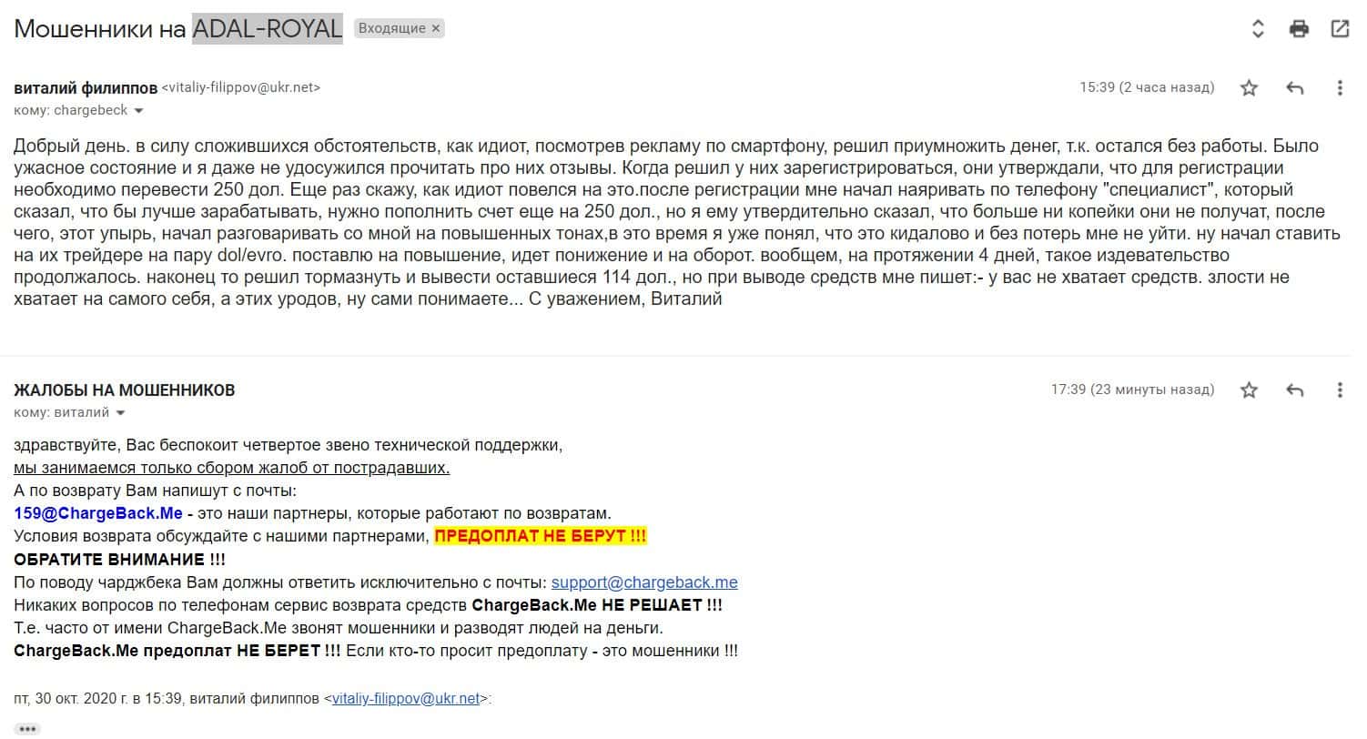 Далее на скриншоте предлагаем ознакомится с очередной жалобой на мошенническую компанию Adal-Royal, которая не выводит денежные средства автору этого материала.