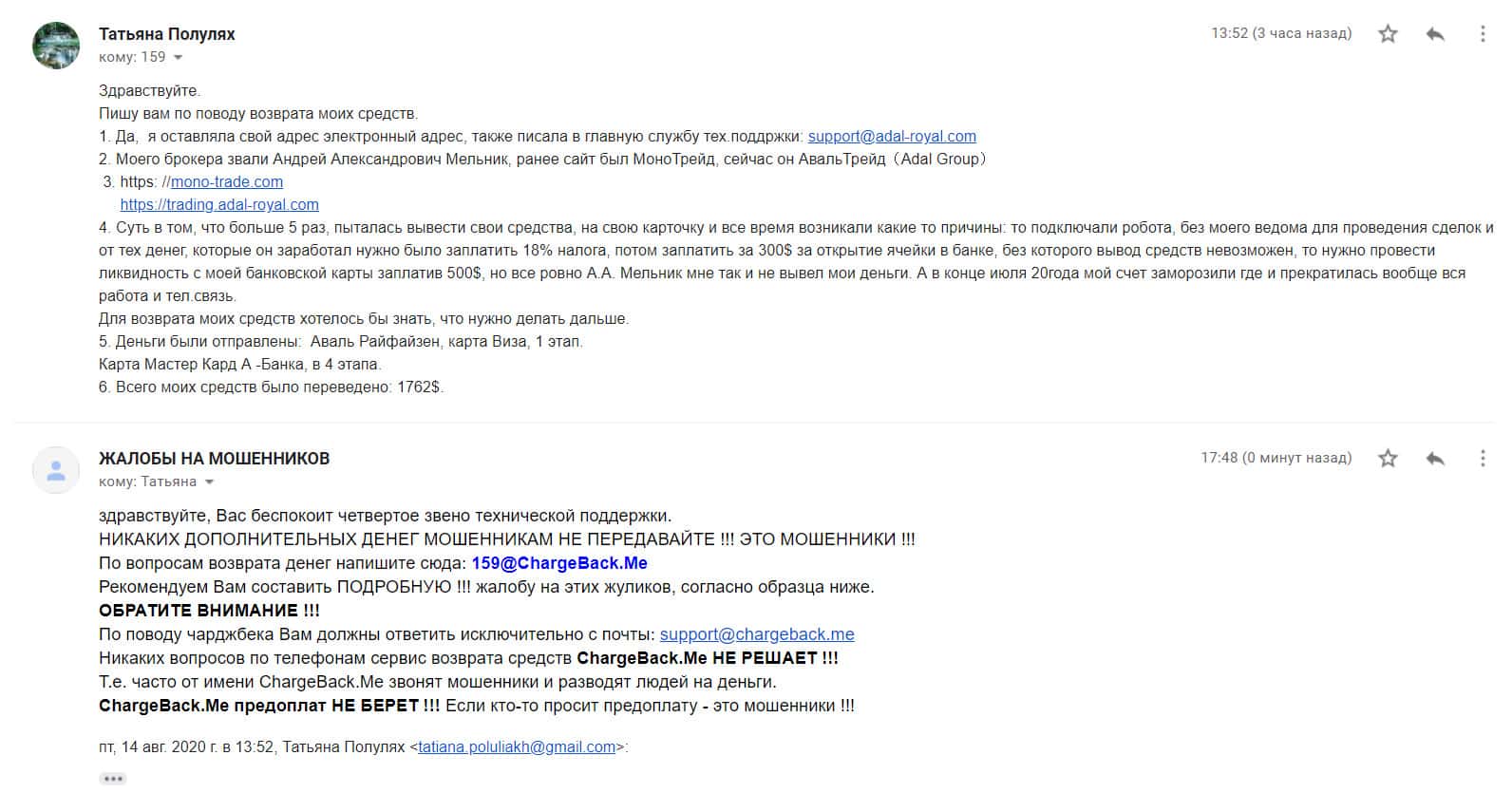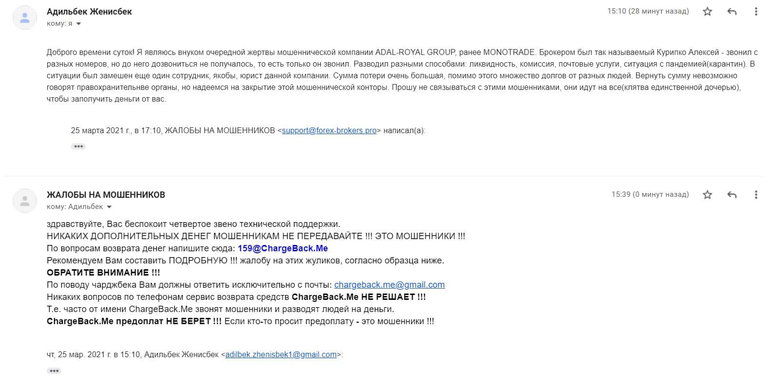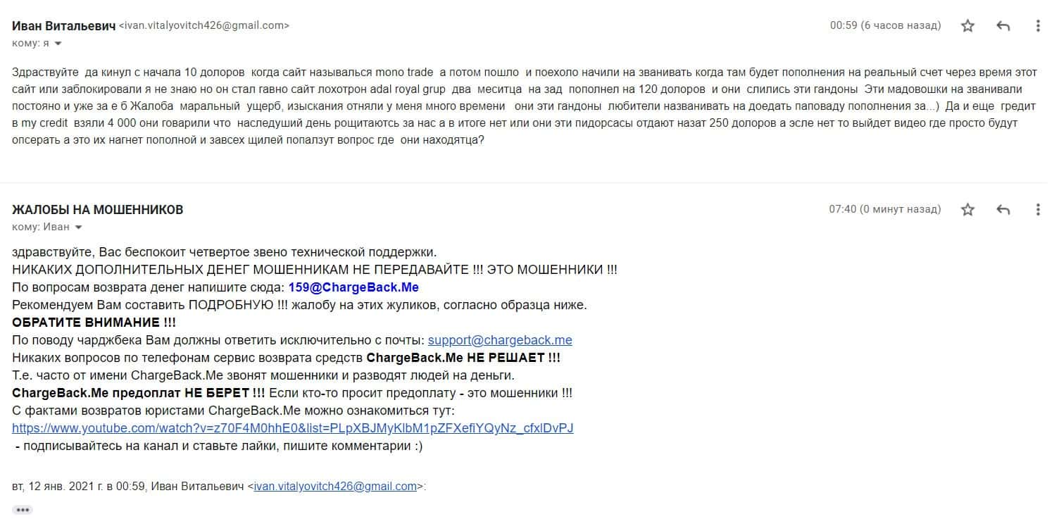 Спустя некоторое время пострадавший клиент прислал более детальную жалобу на мошенническую организацию Адал Роял, которая является одним целым с жульническим проектом МоноТрейд.