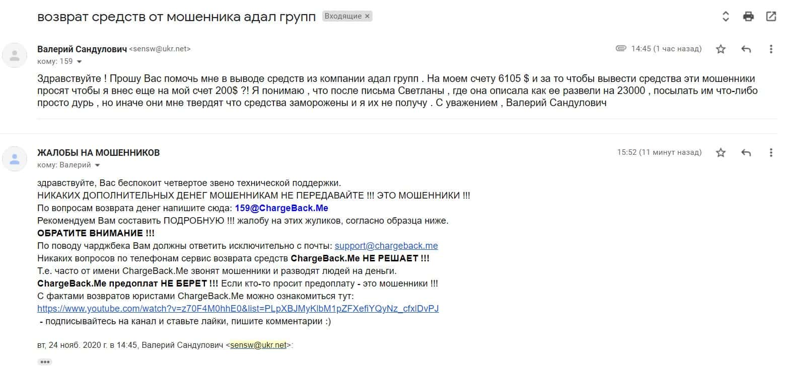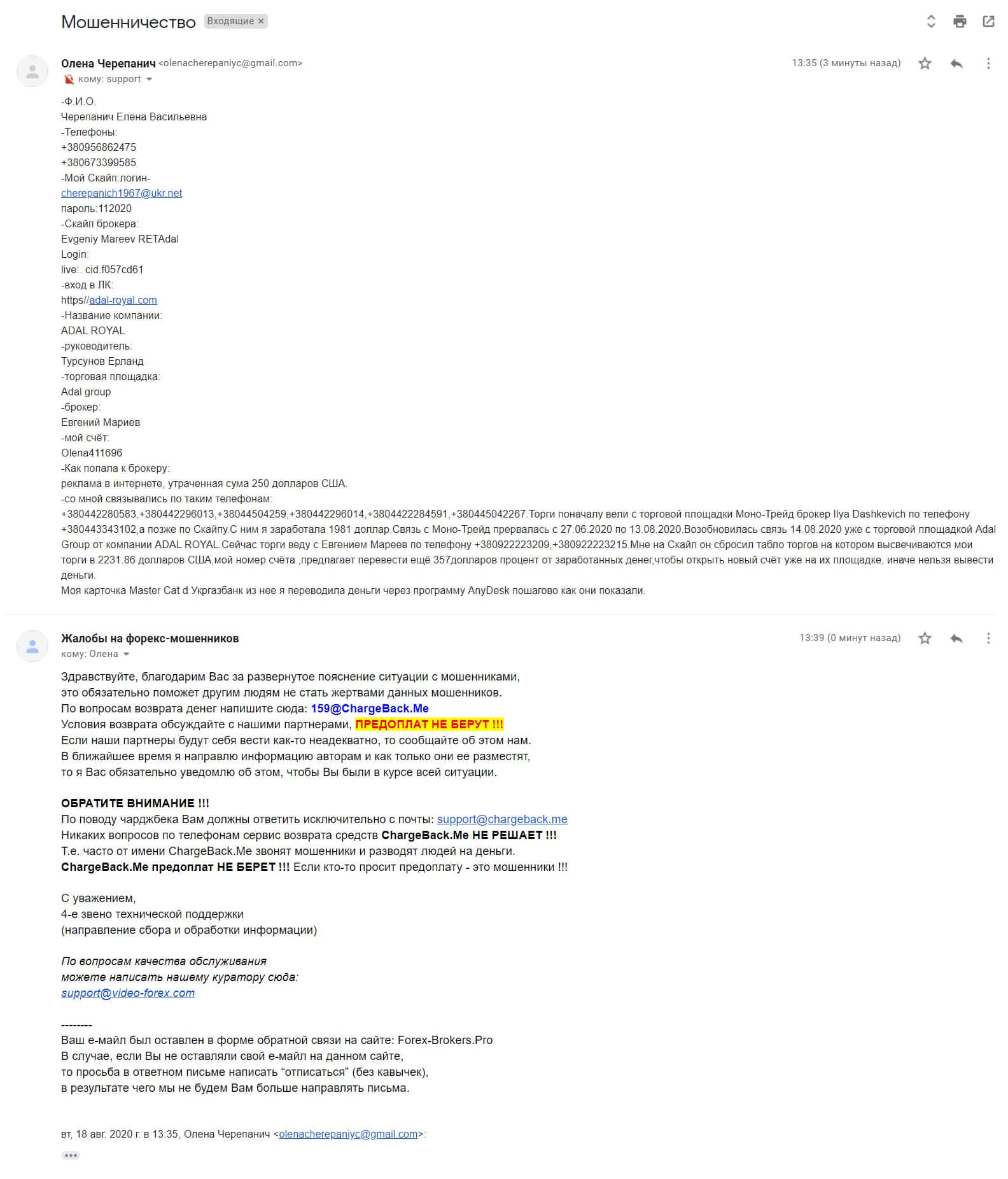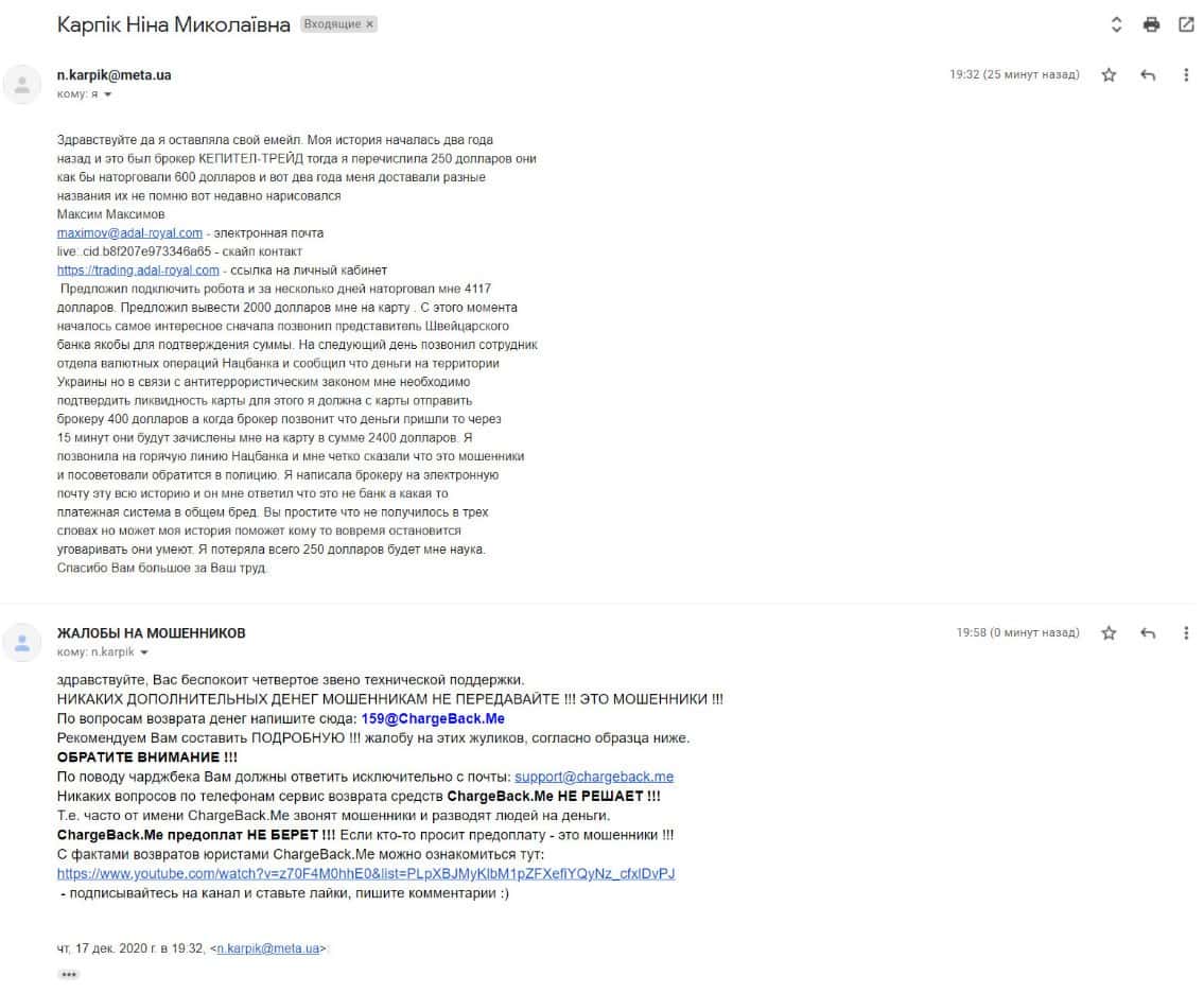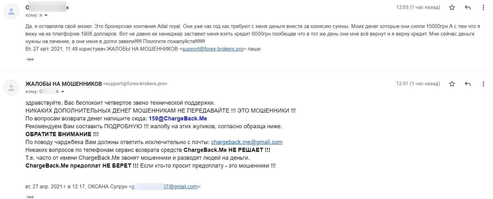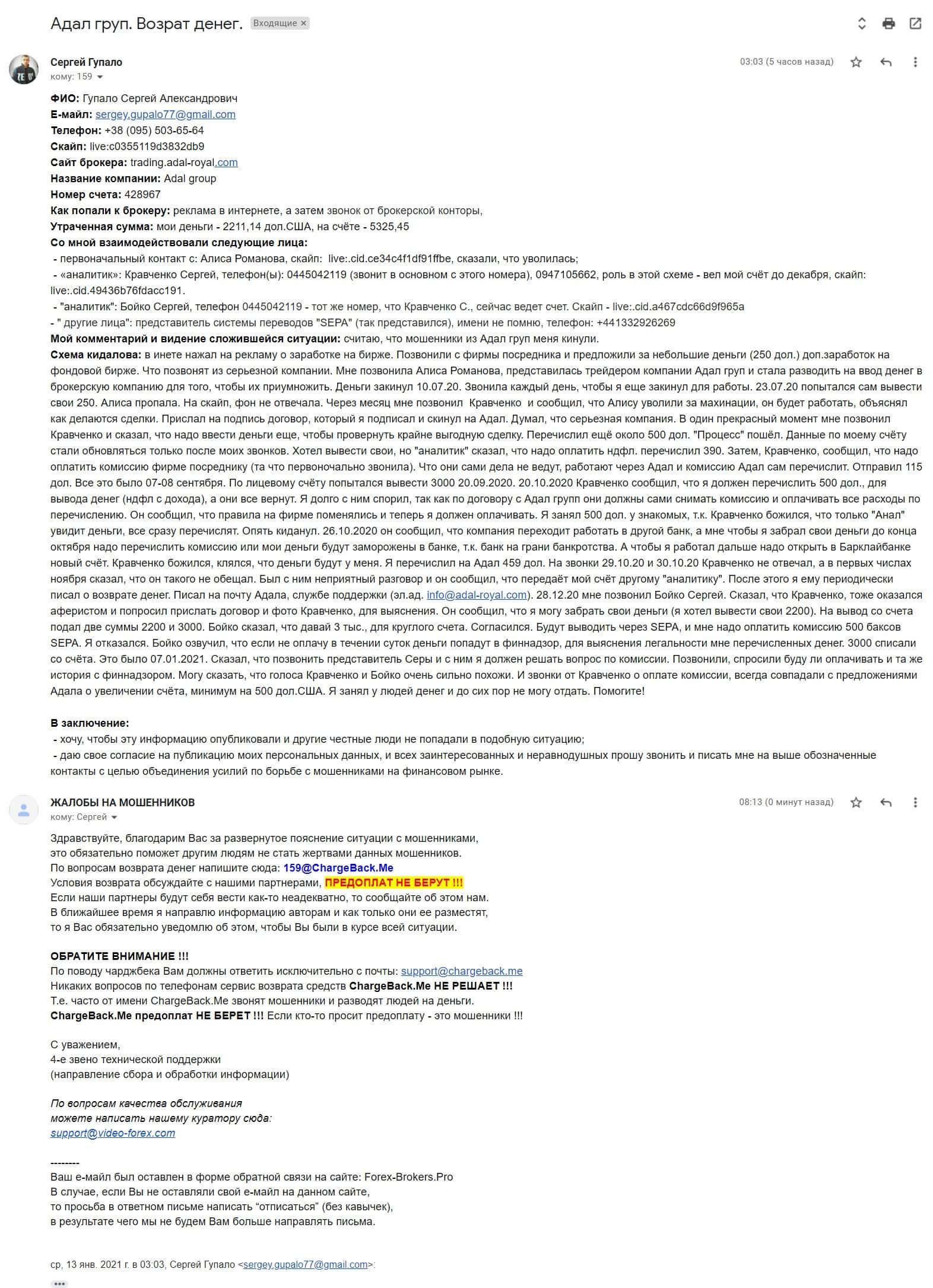 Очередная жалоба на мошенников в лице брокерской компании Адал Роял пришла на почтовый адрес интернет-площадки, разоблачающей деятельность аферистов в сети Интернет.