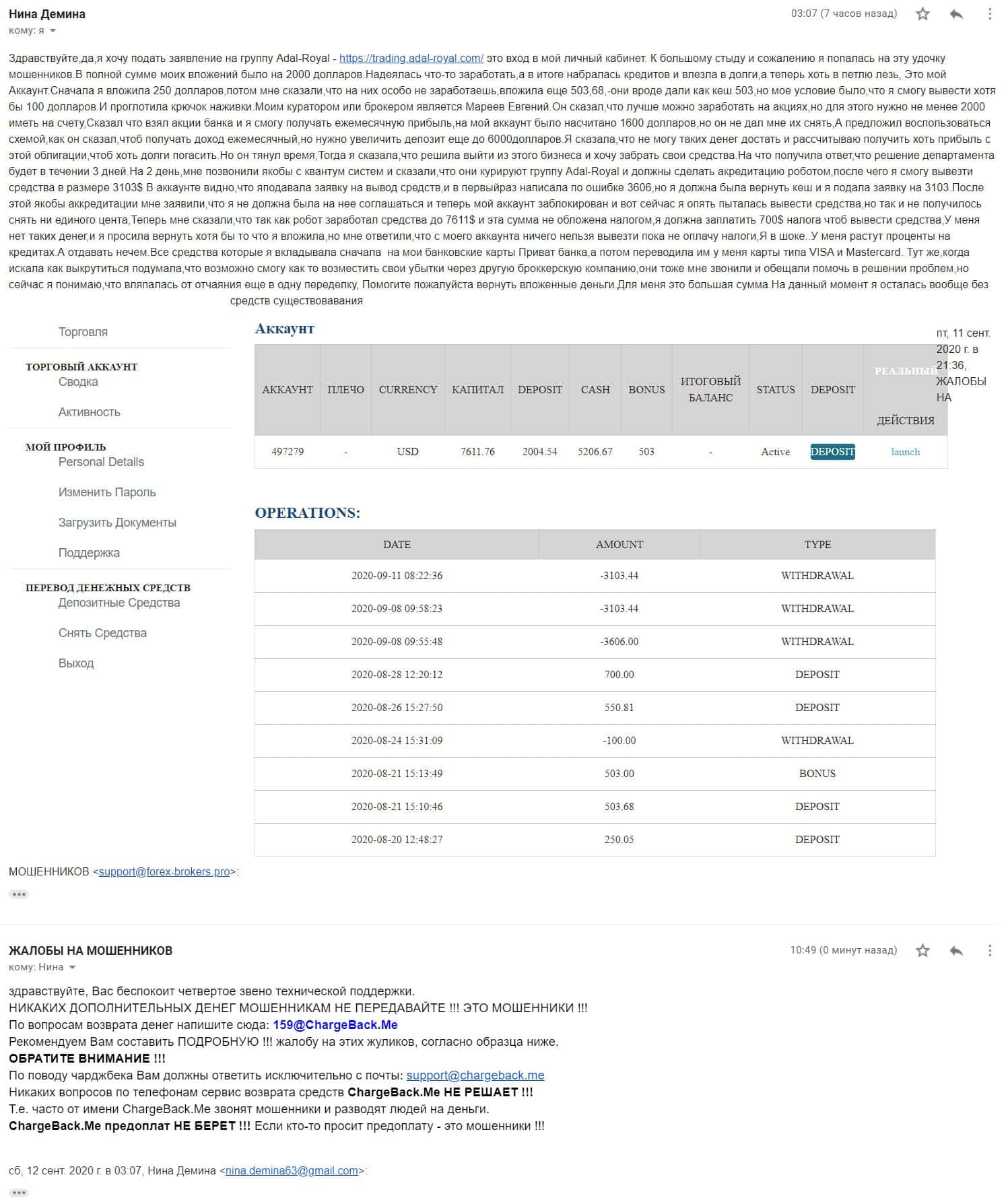 В данном разделе предлагаем увидеть информационный материал в виде жалобы на мошенническую контору Адал Роял, которая не вывела клиенту 12414 долларов США.