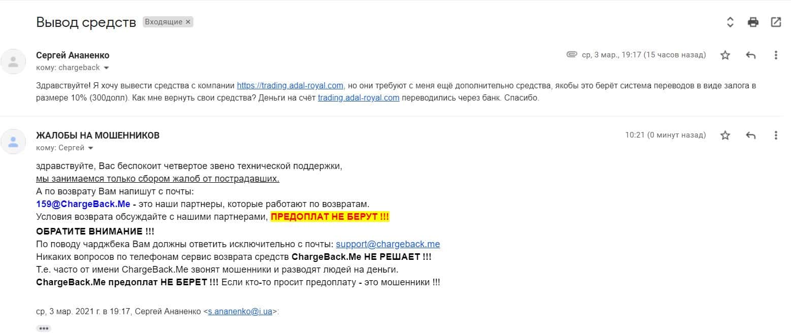 Перед вами жалоба клиента конторы Адал Роял, которому фирма аферистов отказывает в выводе его средств, заставляя при этом внести ещё средства на счёт компании.