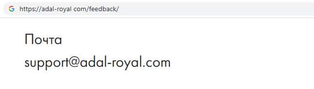 Шулера Адал Роял на своем официальном интернет-ресурсе указывают лишь один адрес электронной почты, а именно: