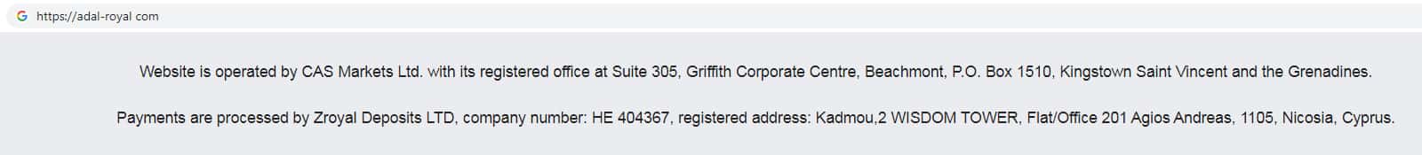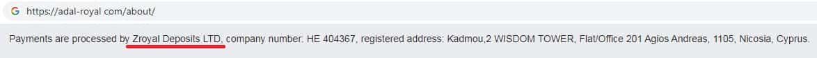 Также известно, что юридическое лицо Zroyal Deposits LTD владеет мошенническим интернет-ресурсом adal-royal com, тоже находится в оффшоре.