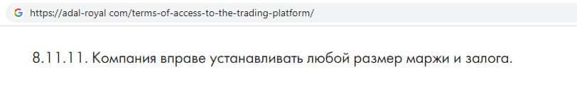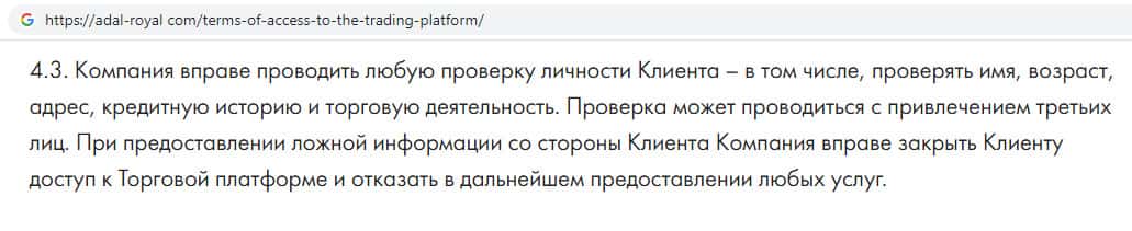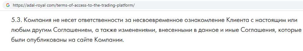 Ниже предоставлена полная версия клиентского соглашения мошеннической организации Адал Роял, которое подтверждает то, что перед нами очередная форекс кухня.